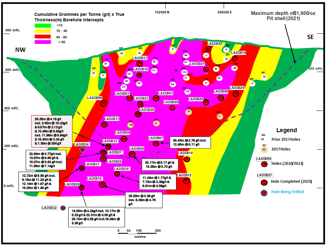 - Results from hole LADD033 reported multiple gold intersections including 26.36 metres grading 4.19 g/t gold, 6.87 metres grading 2.13 g/t gold, 15.49 metres grading 6.92 g/t gold, 16.40 metres grading 3.24 g/t gold and 1.36 metres grading 298 g/t gold